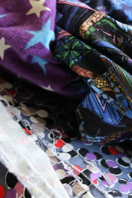 With the fleece fused to all coordinating fabric pieces, place each main fabric piece right sides together with a coordinating piece. Pin in place.